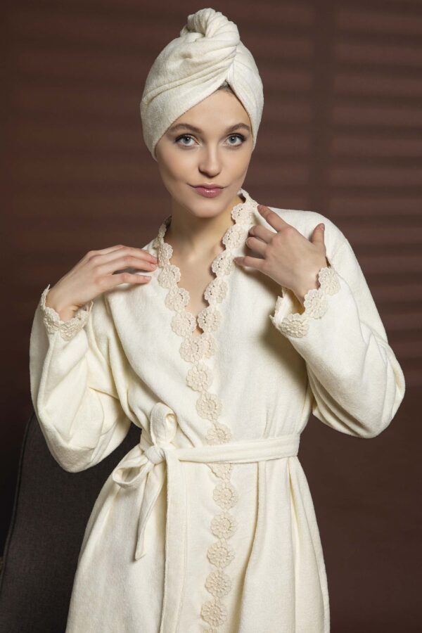 Accappatoio con collo kimono realizzato in morbida spugna Made in Italy cimata leggera di cotone. Davanti, fondo e polsi arricchiti da applicazioni di lista macramè con sequenza di fiori traforati in filo poliestere cotoniero in tinta alla base di spugna, cuciture interne tutte ricoperte da bordino di cotone, tasche a sacco invisibili inserite nei fianchi, maniche lunghe e lunghezza al polpaccio.