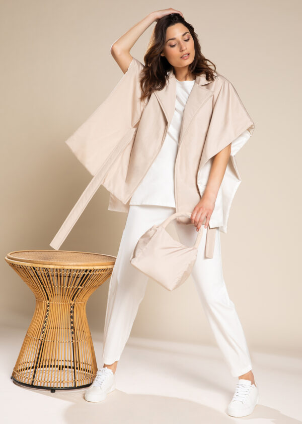Mantella smanicata con collo revers in tessuto fiocco di poliestere. Indossabile aperta o chiusa con cintura nello stesso tessuto, presenta fianchi aperti, assenza di tasche e una lunghezza a mezza coscia che ne sottolinea l’allure elegante e fluida