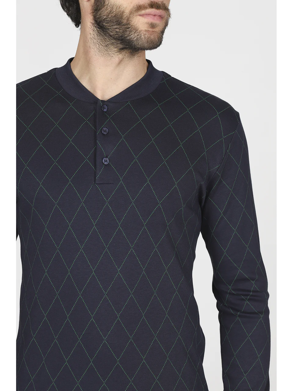 Realizzato in morbido modal, offre una sensazione di leggerezza sulla pelle, ideale per le notti di riposo. La parte superiore presenta un raffinato scollo a colletto, rifinito con pratici bottoni, mentre il classico motivo a rombi aggiunge un tocco distintivo e di classe al look.