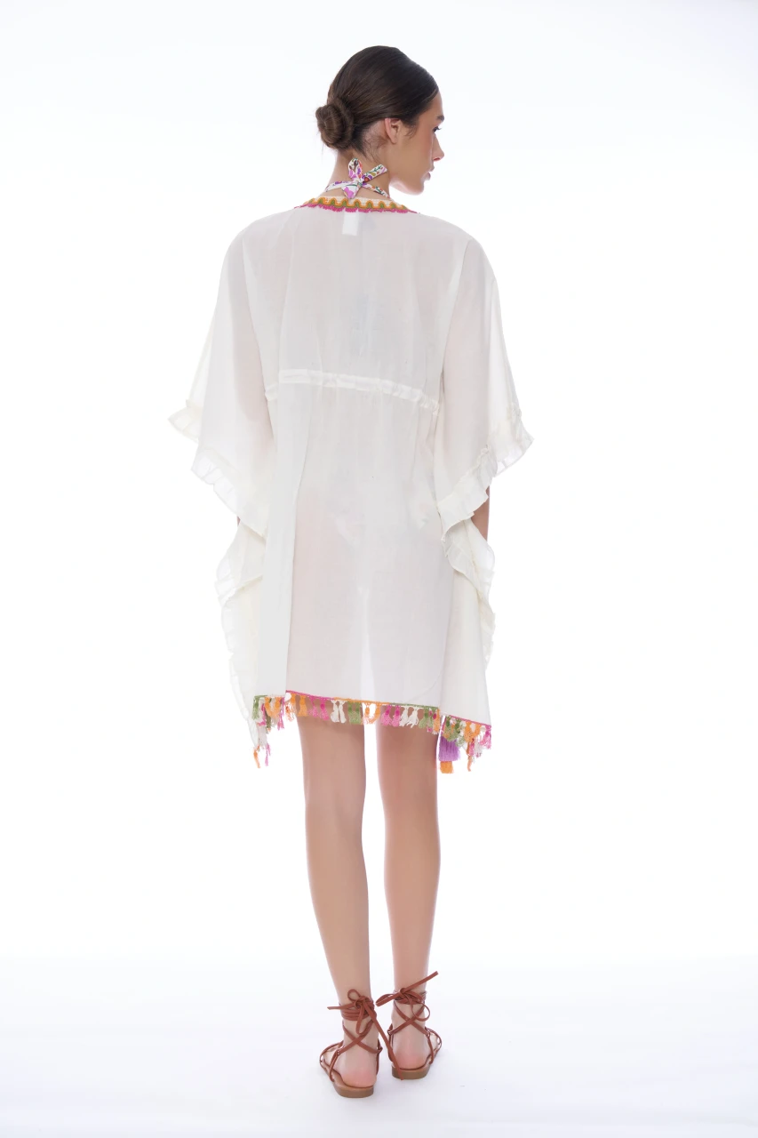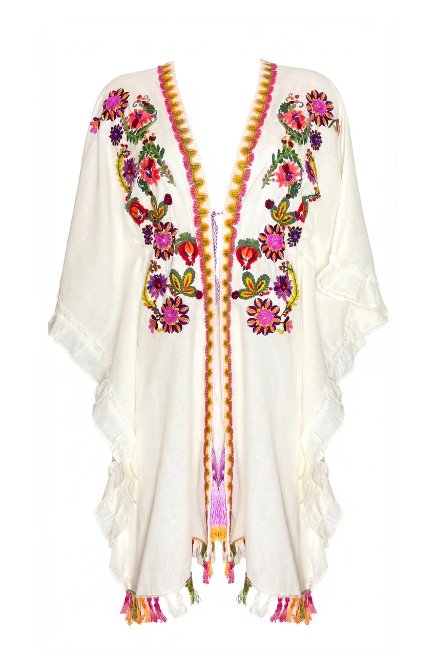 Questo capo, ispirato a un universo naif e solare, si distingue per i ricami floreali multicolore, che creano vivaci contrasti. La silhouette ampia e leggera è impreziosita lungo i bordi da giocose nappe che donano dinamismo e un tocco handmade tipico della beach couture del brand. Il poncho presenta una chiusura frontale, rendendosi perfetto come capospalla versatile per passare con eleganza dalle terrazze assolate alle spiagge tropicali. Un capo sartoriale che trasforma ogni look in un’esperienza di viaggio da indossare.